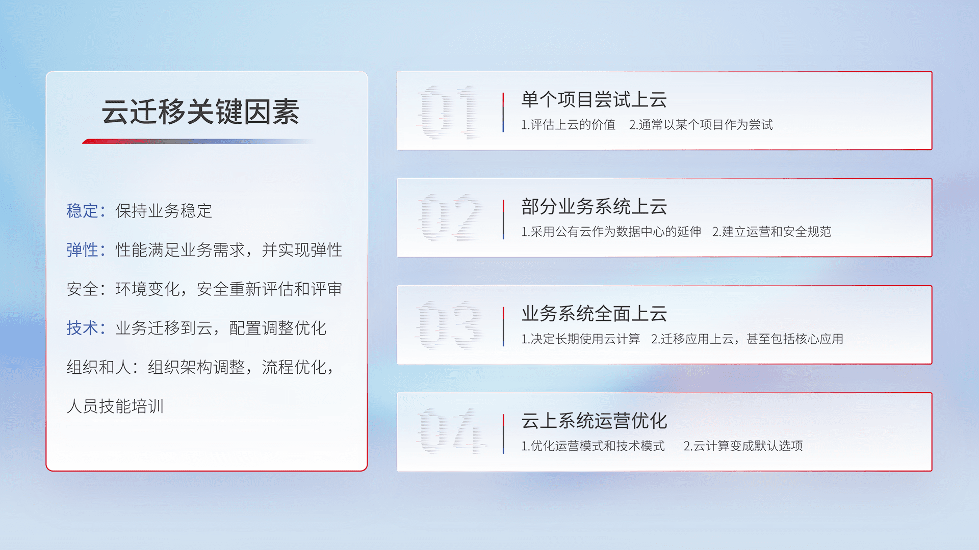 结合实际业务,,,从规划设计、、、、云平台选型、、、、云原生改造、、数据迁移、、、、集成交付,,,,迁移全过程为客户识别最佳上云路径,,做好风险识别管理,,,,设计网络架构、、身份权限、、安全审计合规、、操作审计、、日志审计、、监控告警策略、、多站点容灾设计等,,,对云上基础设施进行整体规划,,,提升IT治理水平,,,,以满足弹性、、高可用、、、高性能的需求。。。