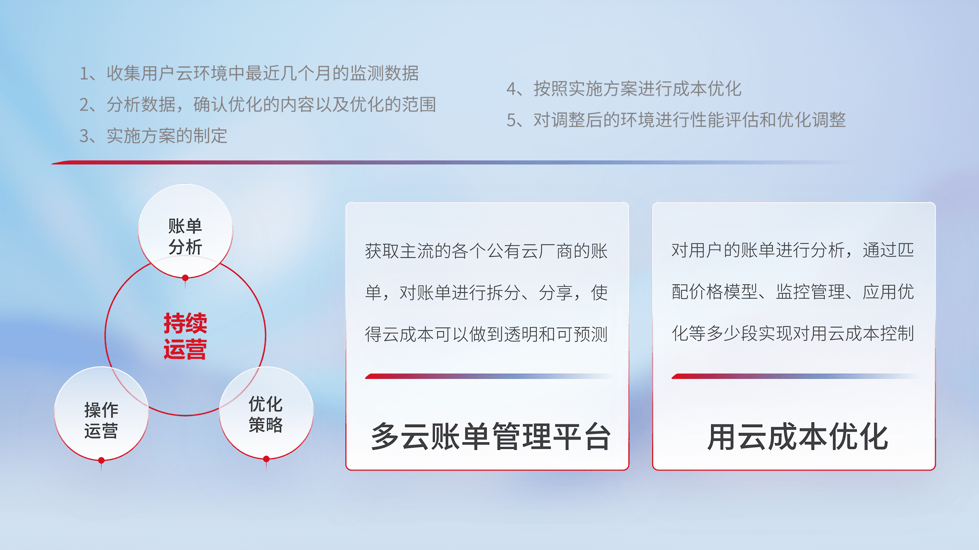 通过多云纳管,,以统一的资源数据模型把客户的云资源进行抽象和封装,,,,进而实现对多云资源的统一操作,,保障云资源管理的可靠性、、、、稳定性与可用性。。量身定制化运维内容,,,,配置、、、、开发运维、、、、补丁管理、、、、备份、、监控、、、、认证和访问管理、、、、审计和日常巡检等,,,保障在用云过程中的可靠度,,,,稳定度以及高可用率。。。。